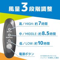 内蔵された二つのファンが、背中に絶えず風を送り込み続けてくれます。蒸れやすい背面と座面には通気性の高いメッシュ生地を採用。風量は3段階の調整が可能、源を押すたびに、低(LOW)→中(MIDDLE)→高(HIGH)と切り替わります。