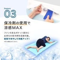 雲のねいろマット りょうは”涼感”に特化しています。5つのファンから吸気し、マットの内側を通った風が表面に吹き出して体を冷却します。手持ちの保冷剤を入れることでさらに涼しくでき、快適な眠りをサポートします。
