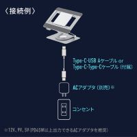 17.3型ワイド/3kgまでのPCを搭載可能。高さと角度を無段階調整でき、台座部分は360°回転します。ファンのノイズレベルは35dBで、オフィスや深夜の作業にも最適。本体サイズは約30×24.5×4.8~17.8cm(幅×奥行き×高さ)、重量は約2.3kg。動作には背面のUSB Type-Cポートへの給電が必要で、USB充電器やモバイルバッテリーと接続して使用します。