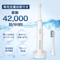 歯周ポケットケアに最適な「極細ブラシ」と、手動歯ブラシと比べて最大1.4倍の歯垢を除去できる「ダブルムーンブラシ」が付属。力の入れ過ぎを防止しながら、42,000回/分のパワフルな音波振動でしっかり歯垢を除去。5モード(White/Clean/Sensitive/Polish/Massage)と3段階(強/中/弱)の強度切替が可能で、2分で自動的に電源がオフになるオートストップ機能も搭載します。