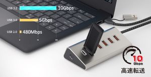 PCからの給電で動作するバスパワー方式を採用しているため、かさばるACアダプターは必要ありません 。デスク周りの配線をシンプルに保てます。 消費電力の大きい機器を複数利用する際は、側面の補助電源ポート(Type-C)にお手持ちの充電器を接続すれば、最大15Wの電力を安定して供給可能です 。