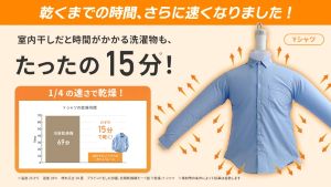 風船のようにふくらむ衣類型のバルーンに、洗濯したYシャツなどを着せて乾燥機のスイッチを押すことで、内側から勢いよく熱風が送り込まれ、まるでスチームのようにシワをのばしながらムラなく衣類を乾燥。室内干しだと時間のかかる洗濯物も、15分で乾かせます。