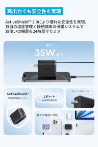 本体にはUSB Type-Cポートを1基搭載し、内蔵ケーブルとあわせて最大2台の同時充電に対応。最大出力は35Wで、1秒間に80回の温度チェックを行い出力を制御する管理システム「ActiveShield 3.0」を搭載しています。折り畳み式プラグを採用したコンパクト設計。カラーはブラックのみだが、ホワイトモデルも発売が予定されています。