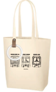 「つり革トートバッグ」は、開口部につり革を取り付けたトートバッグ。持ち手のほか、ベルトにも実使用品を利用しています。バッグ本体には新20系・30000系・400系の前面をデザインしています。価格は3300円。