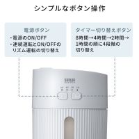 連続運転」(連続使用時:約10時間)と、ON・OFFを繰り返す「リズム運転」(約20時間)の2種類の運転モードを持ち、オフタイマーも設定可能。給電は本体のUSB Type-Cポートから行う。重量は約225g。柔らかい光のLEDライトを内蔵、ナイトライトとしても使えます。