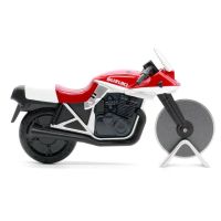 前輪がピザカッターになっていて、未使用時は飾っておけるタイヤスタンドパーツが付属します。本体サイズは18×6cm(幅×高さ)、重さは85g。なお、食器洗い乾燥機は使用不可。スズキ自動車オフィシャルライセンス品。本体カラーはレッドのほか既発売のシルバーをラインナップ。