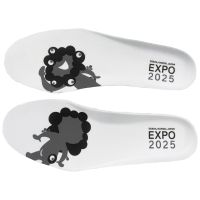 開幕時に発売したモデルと同じ「THE MIZUNO ENERZY」をベースとして、今回はミャクミャクをイメージした黒いミッドソールの凹凸感が特徴。グレーのアッパーはニット素材で通気性がよく、高いフィット感も備えるとのこと。