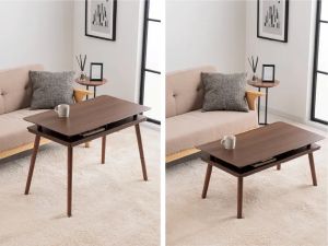 天板部が2層になっていて、天板下がシェルフ(棚)として使えるというもの。例えば、食事の時にはテーブルに散らかっていた小物を、サッとシェルフに片付けられます。付属する高さ20cmの継脚を取り付けると、ソファに座った際にちょうど良い高さでパソコン作業や食事がしやすいセンターテーブルとして使用でき、継脚を外せば、床に座ってゆったりとくつろげるローテーブルに変えられます。