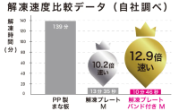 同社が40gのロック氷の溶ける時間を比較した際は、まな板の139分に対し、解凍プレートMは13分35秒、バンド付き Mは10分46秒だったとのこと。解凍のほか、お弁当の粗熱とり、手作りお菓子や離乳食を冷ます時にも使えます。バンドは取りはずして洗えるため、衛生的に使用可能。