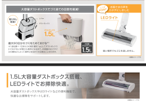 ダストボックスには最大90日分のゴミを溜めることが可能。日々の掃除におけるゴミ捨ての手間やホコリが舞う不快感を軽減できます。クリーナーのヘッドには、LEDライト付きパワーブラシを搭載。暗い場所のゴミが見えやすく、取り残しを防ぎます。連続運転時間は、標準モード約30分/強モード約10分。