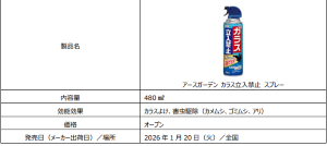 アース製薬は、鳥獣被害対策市場へ本格参入する一環として、ゴミ置き場などでのカラスの被害を軽減する「アースガーデン カラス立入禁止 スプレー 480ml」を、1月20日に発売します。カラスの忌避効果を持ちながらも、人にはやさしい香りで、カラスを傷つけることもない。ゴミ置き場やマンション・団地のゴミ回収BOXなどで利用可能。価格はオープン。