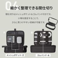 内部にはゴムバンドとメッシュポケットを搭載し、ケーブル・充電器・USBメモリなど小物類を固定しながら整理できポーチ内のごちゃつきを防止してくれます。
