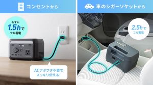 ACポート×1のほか、シガーソケット×1、USB Type-Cポート×2、USB Type-Aポート×2トを装備。USB Type-Cポートは1ポートが最大65W、もう1ポートが最大30WのUSB PDに対応します。