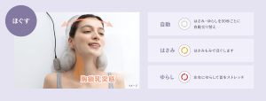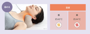 左右に揺れる独自の動きで首のコリをほぐしながら、首後ろに内蔵した温熱ヒーターで同時に温められます。左右に揺れる動作速度は「プロもみ/ゆっくり/ふつう」の3段階、ヒーター温度は「低(約40℃)」または「高(約44℃)」の2段階で、それぞれ設定できます。