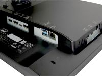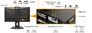 両モデルとも仕様は同じで、フルHD(1920×1080)解像度に対応する23.8型ワイドTFT液晶ディスプレイを採用しています。左右上下の視野角178°、最大輝度は350cd/㎡、リフレッシュレートは最大100Hz、応答速度は最速4ms。映像入力端子は、USB Type-C×1、DisplayPort×1、HDMI×1を備えています。USB Type-Cポートは最大65WのUSB PD出力に対応、接続したPCに給電可能。同時に、ドッキングステーションとして、有線LANポート(ギガビット対応)×1、USB Type-Cポート×2、USB Type-Aポート×2を利用できる(USBのデータ伝送はいずれもUSB 5Gbps対応)。