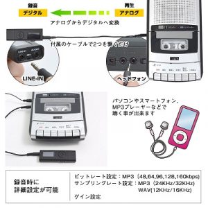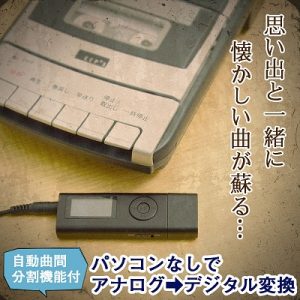 録音したデジタルデータは、今のCDアルバムと同じように1曲、1曲別のデータになっているから、スキップや頭出しが出来るようになります。オーディオケーブルが付属していますので、本体とカセットプレイヤーなどと繋ぎ、後は録音スタートと再生スタートを行えば、自動的に快適な音楽データが完成します。