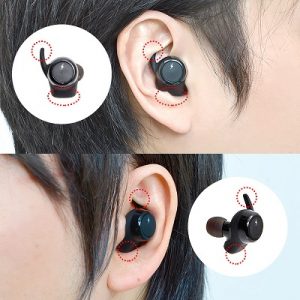 イヤホン本体の出っ張りとイヤーフックが、耳の内側2つのくぼみにしっかりとハマり、耳から外れてしまわないようになっています。音楽再生時間は、最長で約3時間。待機時間は約10時間。約1.5時間で満充電されます。