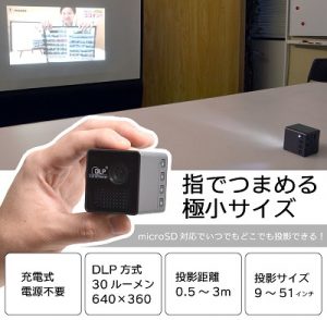 サンコーから発売された、電源&接続不要「指でつまめるミニDLPプロジェクター」は、microSDカードに再生したいファイルを入れるだけで、いつでもどこでも投影できる充電式小型プロジェクターです。価格は15,800円(税込)です。