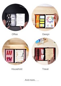 Lockbookの材質はプラスチック、背表紙の部分に指紋認証センサーが埋め込まれていて、指紋認証が通らない限り開くことが出来ません。中身のノート部分は、市販の6穴リフィルをそのまま使えるようになっていて、紙のノート以外に予定表、名刺入れ、写真、付箋、定規、文具ホルダーなどを挟むことが出来ます。