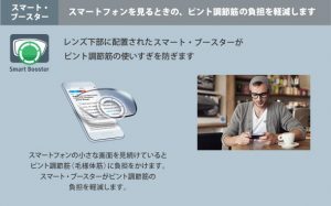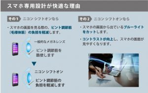 「ニコン シフトオン」の特長1.スマホを見る位置を考えスマート・ブースターを搭載。スマホを見るときに負担がかかる目のピント調節筋をサポートします。2.標準セットのブルーライトカットコートが、画面から発せられるブルーライトを効果的にカット。コントラストがはっきりするのでスマートフォンの画面をよりクッキリ見ることができます。3.普通のメガネレンズの代わりとして自分の度数に合わせて使うことができます。