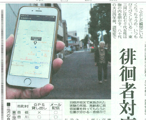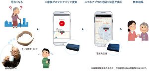 「みまもーら」はGPS位置探索バンドを装着した高齢者やペットの位置を把握し、事故を未然に防ぐシステム。10km離れていても場所を特定できる点が特徴で、徘徊などで行方がわからなくなった場合も、すぐに位置情報を取得できるようになっています。