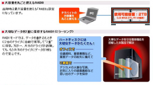 民生用の2ドライブのNASは出荷時のRAID構成がRAID0(ストライピング)になっています。この方式は容量がHDD2台分の合計となり、分散効果によりアクセス速度も速くなるため、訴求力があるからです。その代わり、HDDのどちらか一方が故障するとデータの読み書きできなくなります。また、データ復旧は専門業者以外できません。